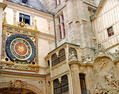 Walking tour in the old town of Rouen, Capital of Upper Normandy with its gothic churches and half timbered houses and the old market square where Joan of Arc was burnt at the stake.